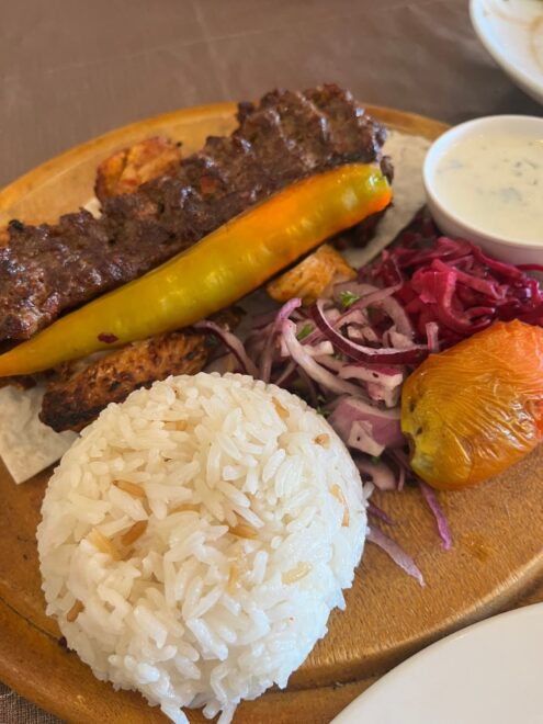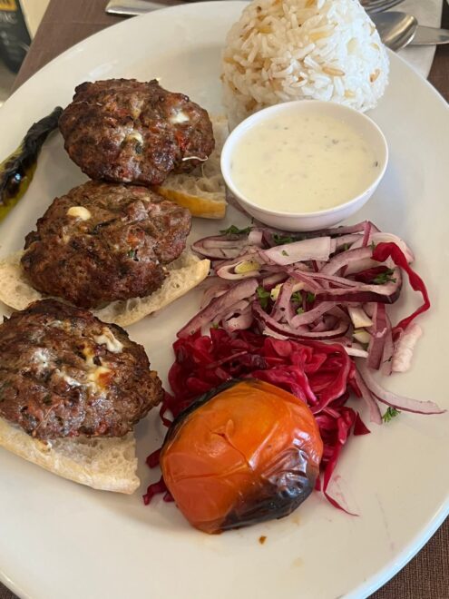 The meatball kebabs were equally satisfying as my teammate devoured the plate. Thick, hand-formed patties, grilled to a beautiful brown, rested on slices of bread that absorbed their juices. You could taste the herbs and spices folded into the meat. Each bite was hearty and comforting, like something made from a family recipe passed down through generations.