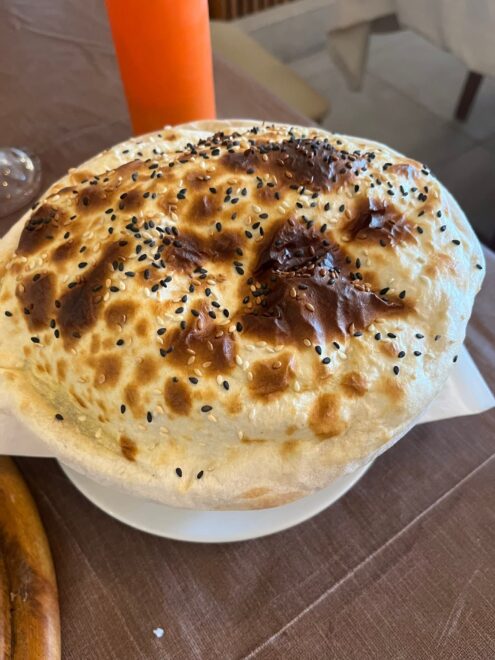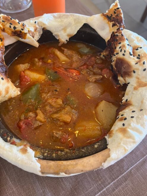 But the highlight was the stew, dramatically sealed with puffed, golden bread on top. When the bread was torn open, steam escaped, revealing a rich, tomato-based stew filled with tender chunks of meat, potatoes, peppers, and onions. The edible crust soaked up the sauce, turning into a soft, flavorful companion to the stew beneath. It was rustic, soulful, and deeply satisfying.