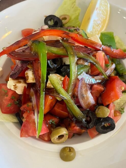 The meal began with a vibrant Turkish salad. It was a colorful medley of chopped tomatoes, zucchini, green and black olives, red onions, and crisp bell peppers, lightly dressed and glistening with Greek sauce. Cubes of creamy white cheese peeked through the vegetables, adding richness to every bite. A squeeze of lemon brightened everything. It was fresh, tangy, and refreshing, the perfect opener that awakened the palate.