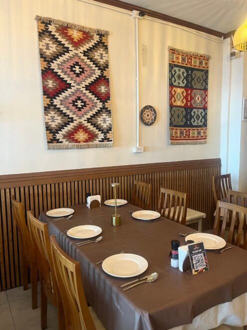 The moment I stepped inside, the atmosphere shifted. Wooden tables neatly set with white plates and cutlery welcomed guests with quiet elegance. Warm yellow pendant lights cast a soft glow across the room, giving it that cozy, intimate Mediterranean charm. Traditional Turkish woven tapestries hung on the walls with bold geometric patterns in deep reds, blues, and earth tones, adding texture and authenticity. Near the entrance, a Turkish flag stood proudly against the glass, a subtle reminder that this was more than just a restaurant; it was a cultural experience. The vibe was relaxed and unpretentious, a place where you could slow down and savor.